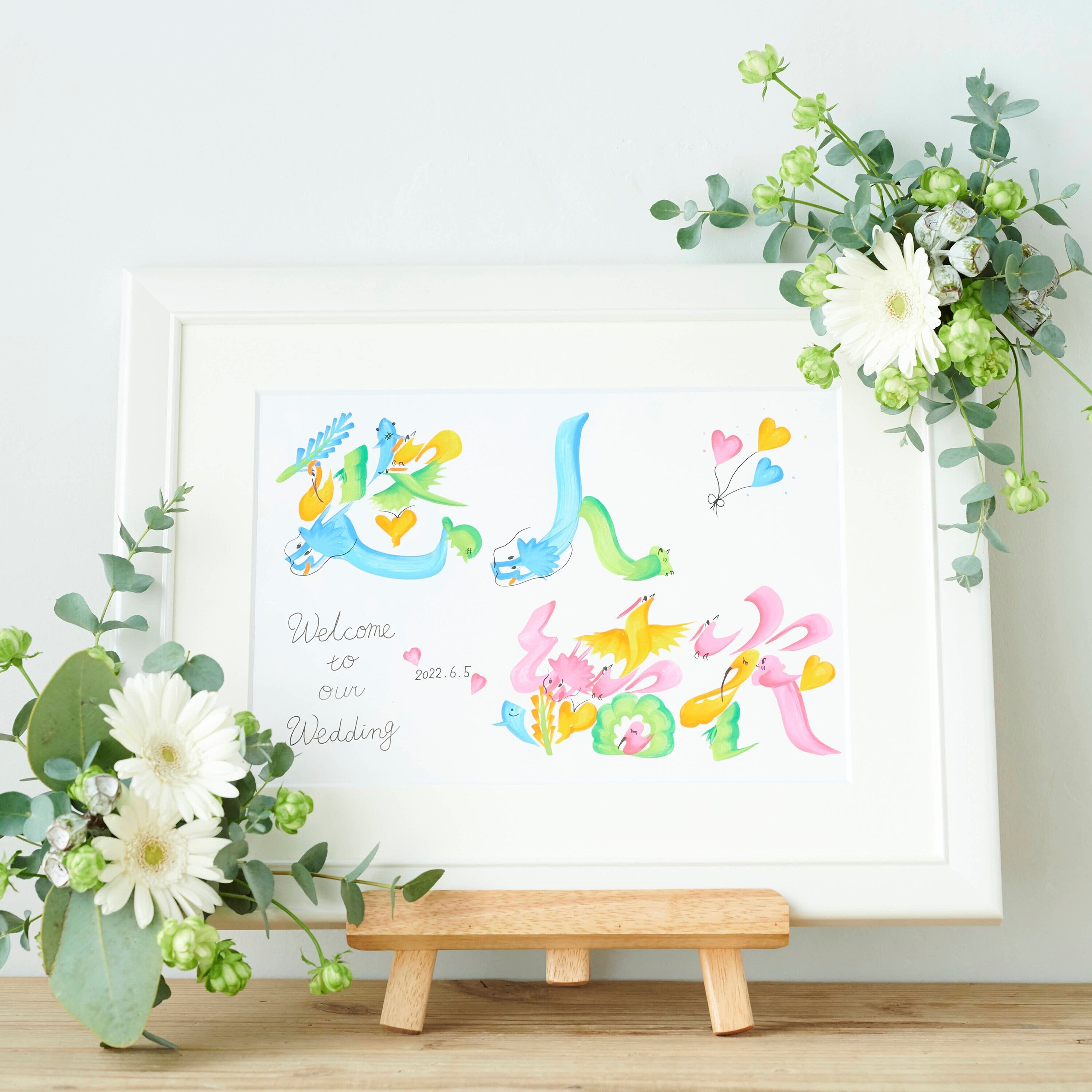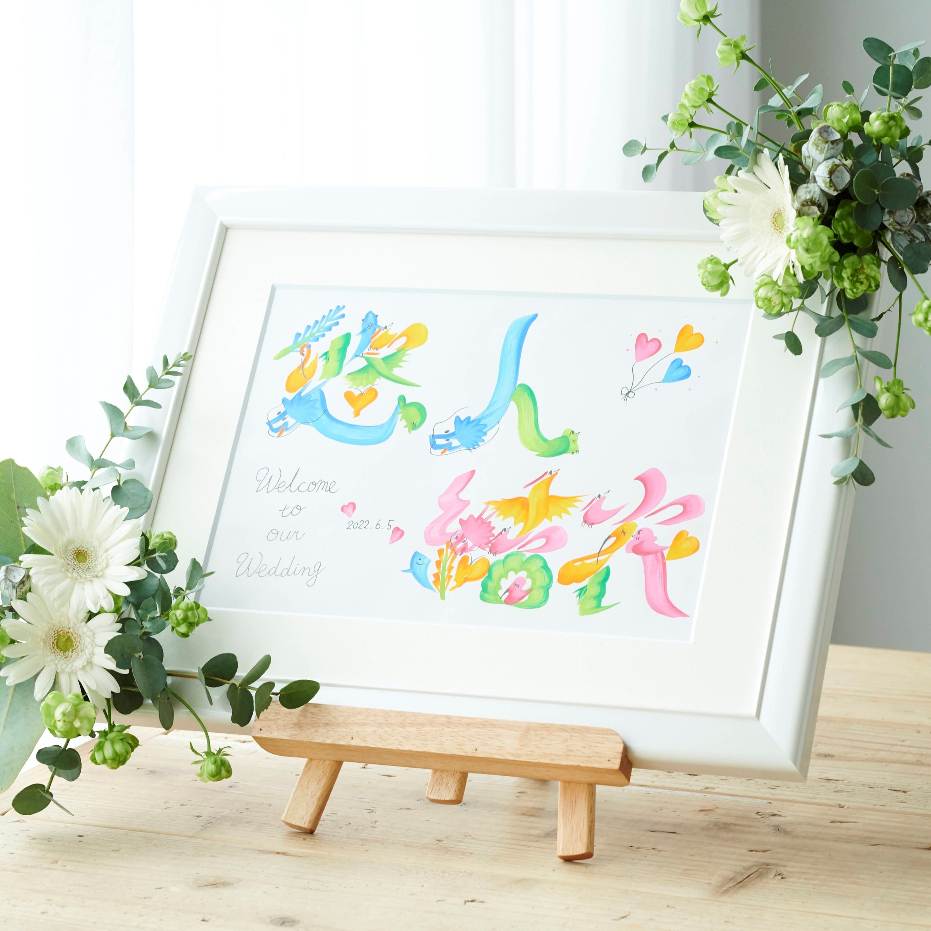 縁起の良い絵柄を用いて、文字を形作る花文字を用いた
