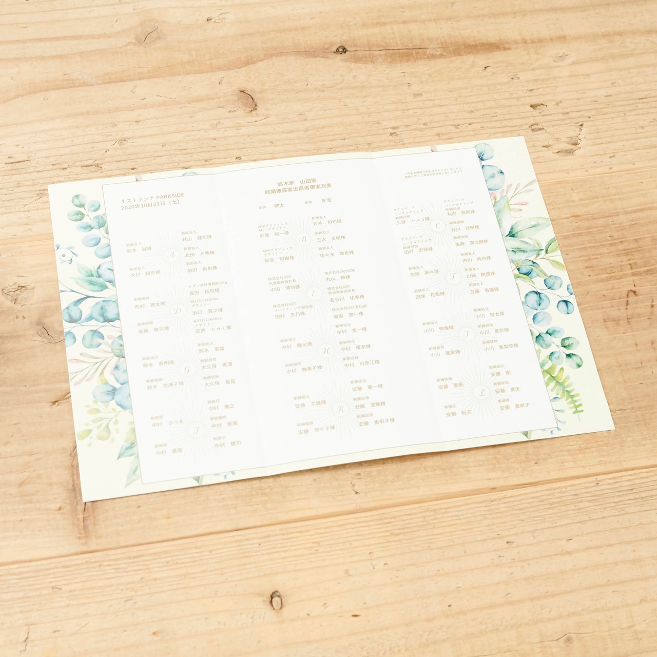 ゲストのお名前を華やかに彩る、花文字デザインの席次表です。